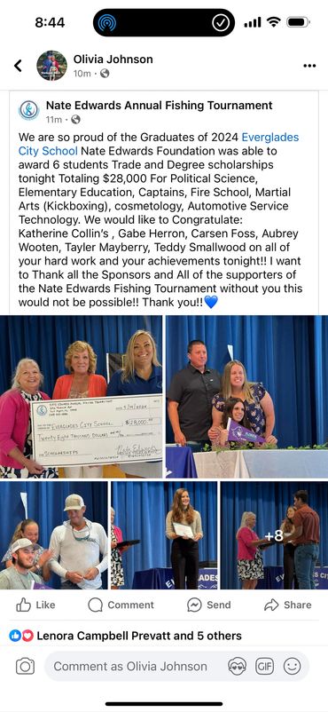 The NATE EDWARDS SCHOLARSHIP Fund was established in 2022 for the graduating class at Everglades City School. This Scholarship opportunity provides student graduates the means to attend a Trade or Captains School of their choice to learn new skilsl and obtain the appropriate certificates for their own future success.